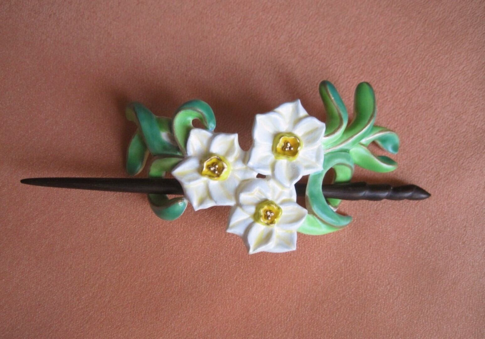 水仙の髪飾り*マジェステ*木製彫刻つげ黒檀*簪かんざし