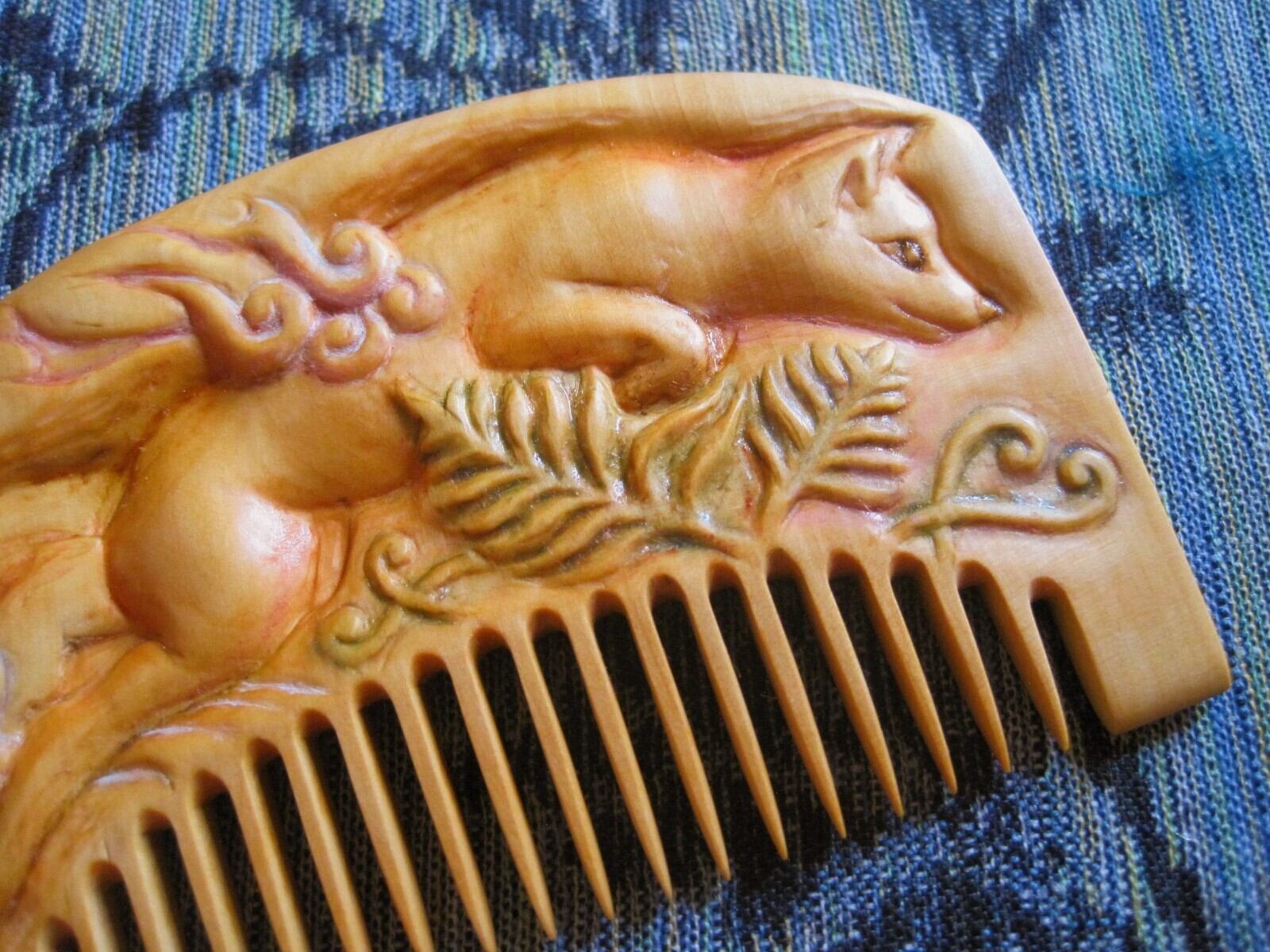 つげの木で櫛を作り、子ぎつねが跳ぶ姿を彫刻しました。